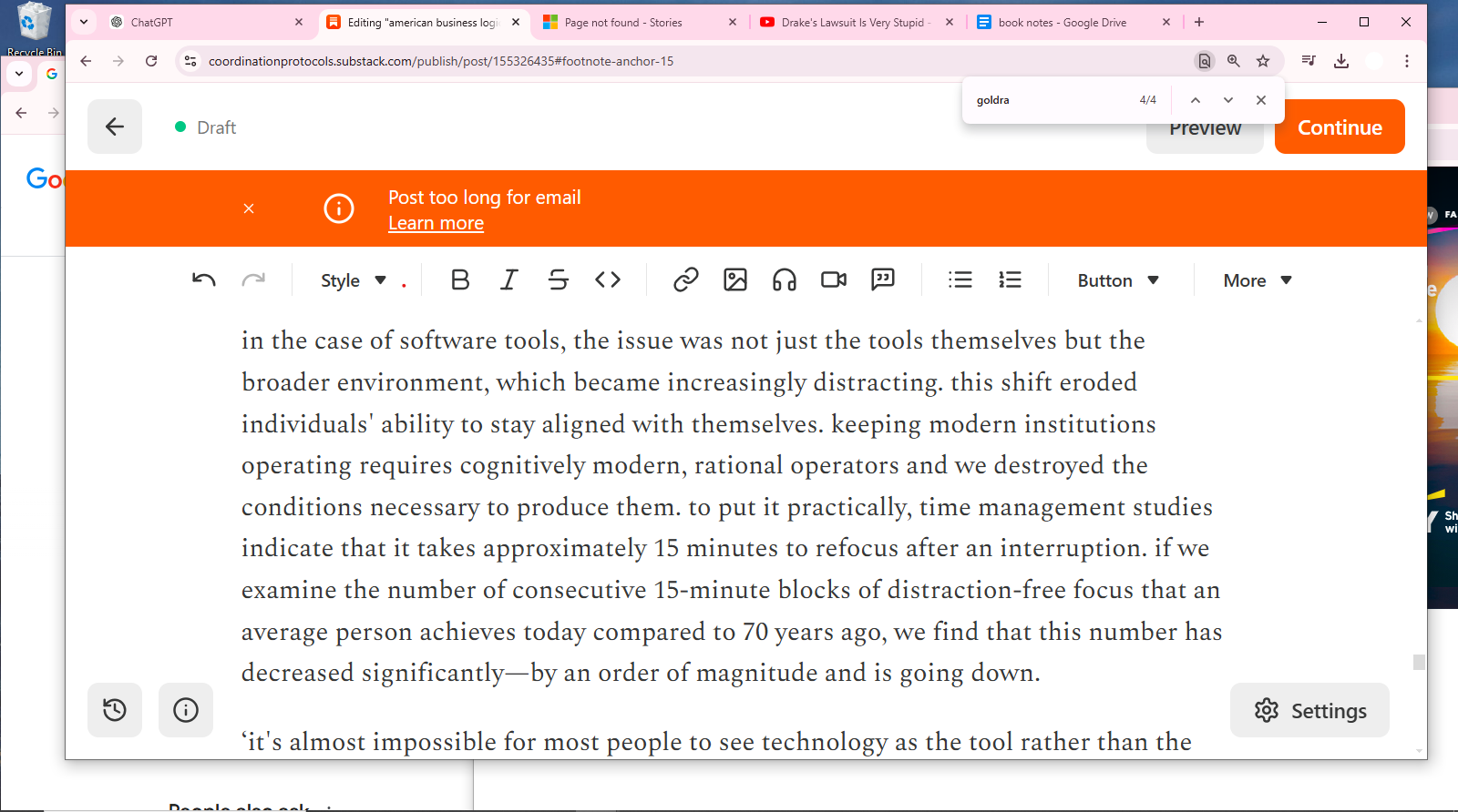 in the case of software tools, the issue was not just the tools themselves but the broader environment, which became increasingly distracting. this shift eroded individuals' ability to stay aligned with themselves. keeping modern institutions operating requires cognitively modern, rational operators and we destroyed the conditions necessary to produce them. to put it practically, time management studies indicate that it takes approximately 15 minutes to refocus after an interruption. if we examine the number of consecutive 15-minute blocks of distraction-free focus that an average person achieves today compared to 70 years ago, we find that this number has decreased significantly—by an order of magnitude and is going down.