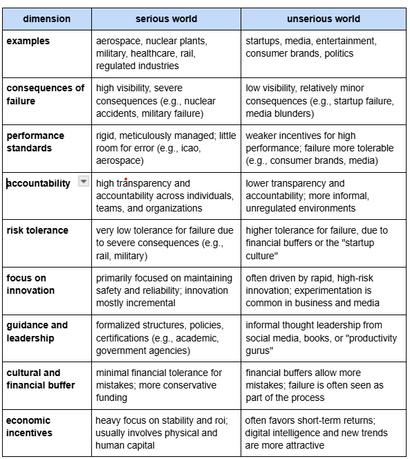 unserious world: conversely, the unserious world encompasses sectors where failure is less visible and its consequences are relatively minor. this includes: startups, media, consumer brands, politics, entertainment businesses. here, the incentives for high performance are weaker, and failures may not have immediate or clear consequences (or we have a large startup). the environment is more tolerant of errors, partly due to cultural and financial capital buffers. thought leadership and guidance often come from less formal sources, such as: essays, social media content, popular books. ‘productivity gurus’. in this world, the systems managing complexity are less stringent, and the transparency of individual performance is lower.