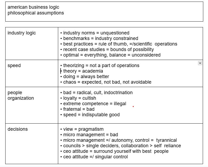 we intuitively understand that american business logic is wrong, but unable to process scale and stuck in a tightly wrapped axiomatic system. not only do we not question these axioms, we increasingly embed these axioms into our daily lives via the diseased, pathogenic and iatrogenic tools and information processes that make up a global shared reality. the day to day game theoretics paired with loss self coordination debt keeps us stuck from facing this reality.