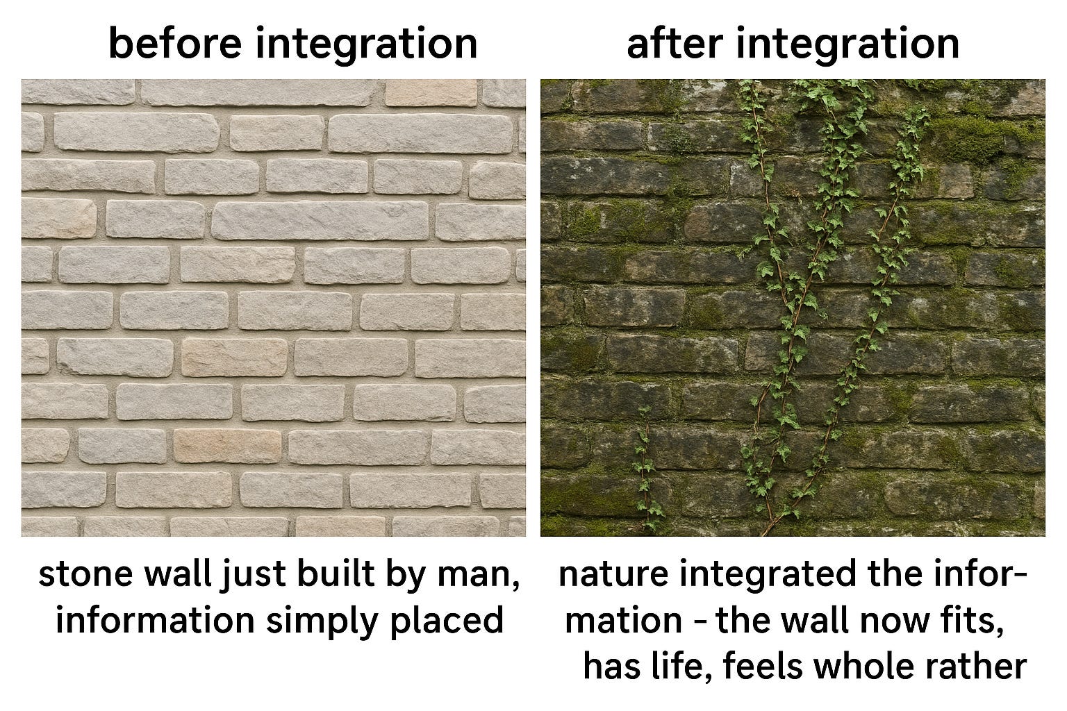 both are about time allowing integration vs imposed structure. nature fitting vs human imposing. information integrating vs information placed.